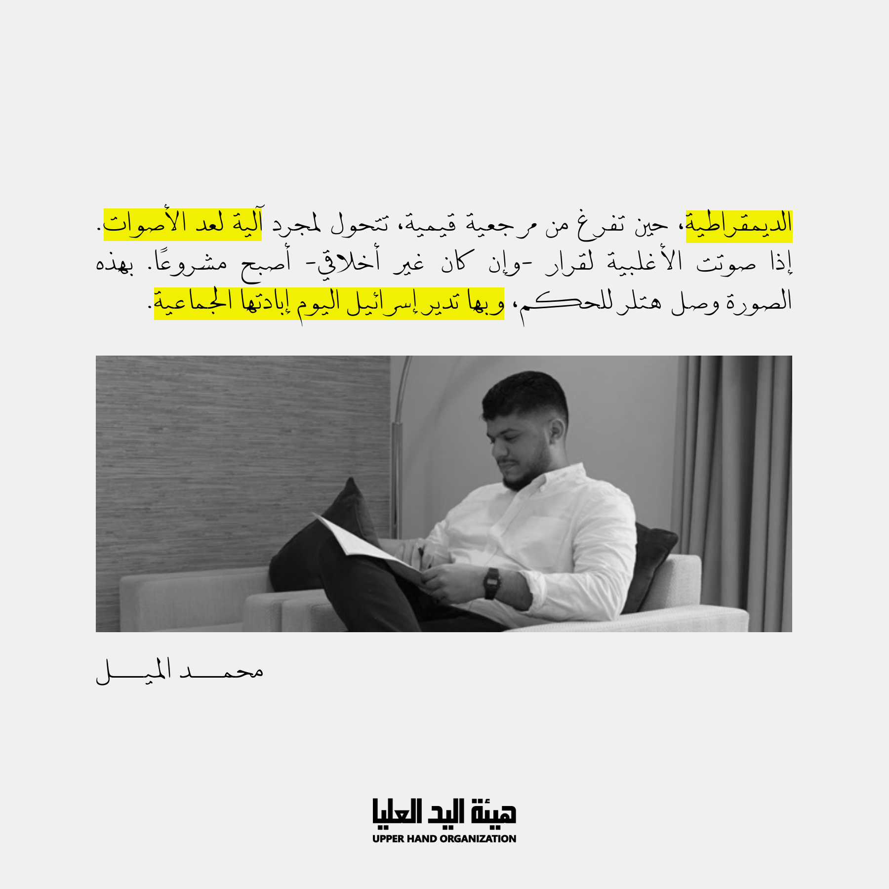 - يشدد محمد الميل على أن الديمقراطية، إذا خلت من مرجعية عليا، تتحول إلى مجرد عملية عد للأصوات باسم “إرادة الشعب”؛ فبهذه الصورة وصل هتلر إلى الحكم، وعلى هذا النحو تدار إسرائيل.