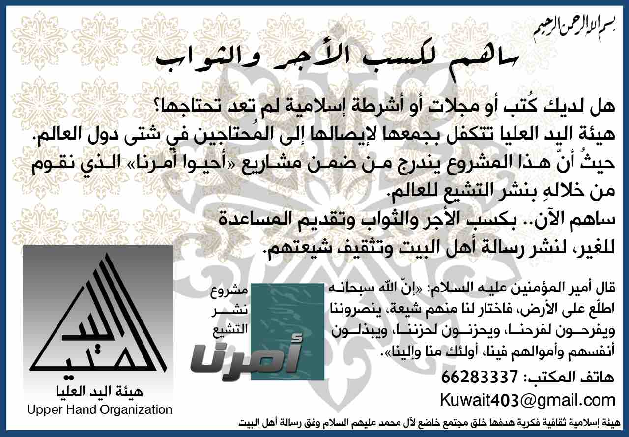 بعد عامٍ كاملٍ من تأسيسها وتثبيت أقدامها صرحًا ثقافيًا وفكريًا، أعلنت هيئة اليد العليا عن إطلاق مشروعها الجديد «أحيوا أمرنا»؛ في خطوةٍ تاريخية لنشر وتعميق معرفة الشعوب برسالة أهل البيت في شتى بقاع الأرض، استكمالاً لمسيرة مبادراتها الرائدة.