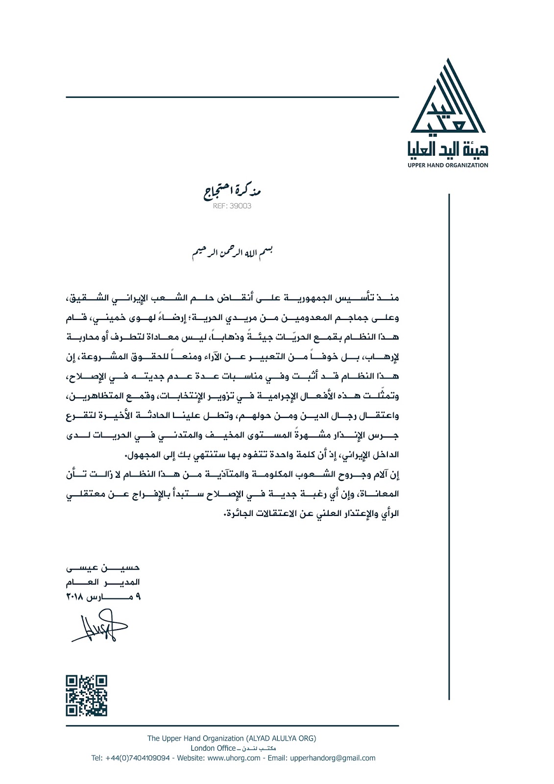 سلَّم العضو المكلَّف من المدير العام لهيئة اليد العليا مذكرة احتجاج إلى السفارة الإيرانية في العاصمة البريطانية لندن معربًا عن استيائه بشأن تدني مستوى الحريات في الجمهورية الإيرانية، موجِّها خطابه إلى ما تبقى من العقول في النظام الإيراني، ومقترحًا الإفراج عن معتقلي الرأي والاعتذار كخطوة أولى وجدية في الإصلاح السياسي والإجتماعي.