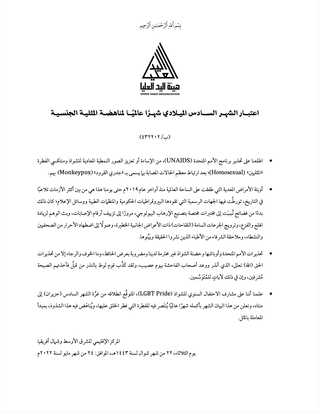 صدر يوم الثلاثاء، 22 من شهر شوال لسنة 1443هـ، الموافق: 24 من شهر مايو لسنة 2022م، عن هيئة اليد العليا البيان التالي (432202): ● اطلعنا على تحذير برنامج الأمم المتحدة…