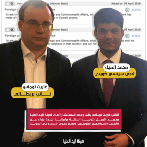 تحديث (19/2/2020م): استلم المستشار العام للهيئة بريدًا إلكترونيًا من النائب البريطاني غاريث توماس يدعوه فيه لتحديد موعد معه، لبحث آخر المستجدات الحقوقية في دولة الكويت وبريطانيا؛ إلا أن جائحة كورونا حالت دون اللقاء.