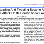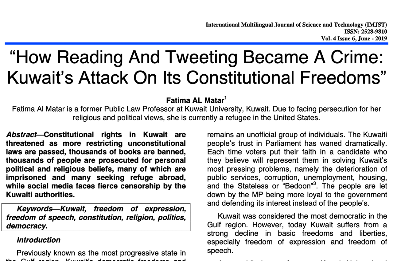 الورقة البحثية التي نشرتها الدكتورة فاطمة المطر، أستاذة القانون العام السابقة في جامعة الكويت، حملت عنوان: (كيف أصبحت القراءة والتغريد جريمة: السلطات الكويت تعادي حرياتها الدستورية How Reading And TweetingBecameA Crime: Kuwait’s Attack On Its Constitutional Freedoms)، وتمحورت حول الحقوق المهددة في ظل تمرير قوانين غير دستورية؛ كحظر آلاف الكتب، ومقاضاة الآلاف من الأشخاص بسبب المعتقدات السياسية والدينية الشخصية، حتى أصبح العديد منهم بين السجن في الداخل واللجوء في الخارج.