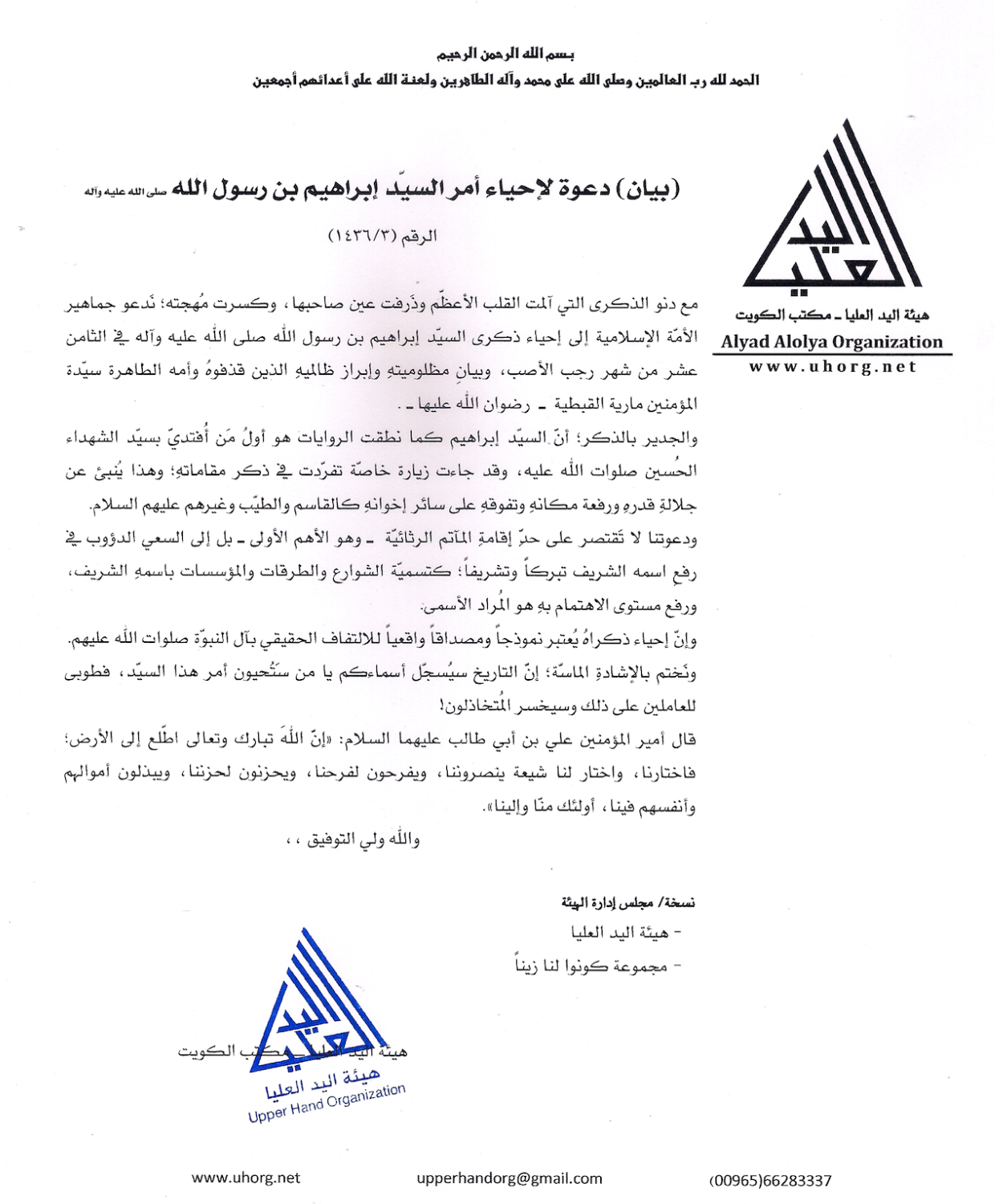 ما إن دعا المستشار العام لهيئة اليد العليا محمد الميل في خطبة له (في الكويت، يوم الخميس، 16 مايو 2014، الموافق 17 رجب 1435) إلى ضرورة إحياء ذكرى وفاة السيد إبراهيم ابن النبي الأكرم، إلاّ باشرت الهيئة بتنظيم حملة أطلقت عليها اسم «ابن النبوة».