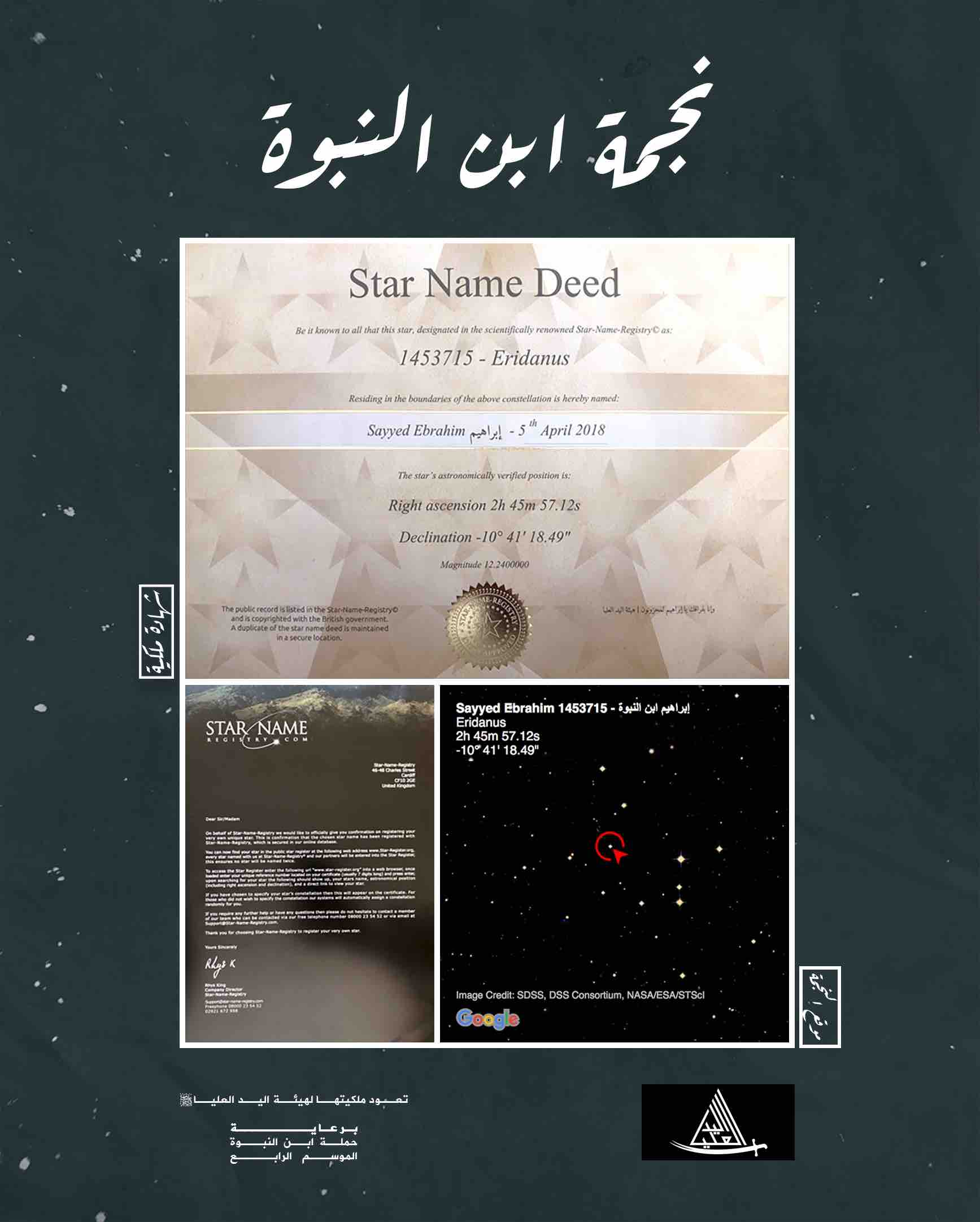 وهكذا، تنوَّعت الوسائل لإلفات أنظار العالم إليه، وبعد تأدية الرسالة الواجبة والمهمة الشريفة، أمرت الإدارة بإيقاف الحملة، وتوَّجت هذا الختام بشراء نجمة سماوية أسمتها باسمه، وها هي اليوم نجمة «ابن النبوة» تلمع في الفضاء حاملةً في مكنونها أسماءً ستُخلِّدها للأبد.