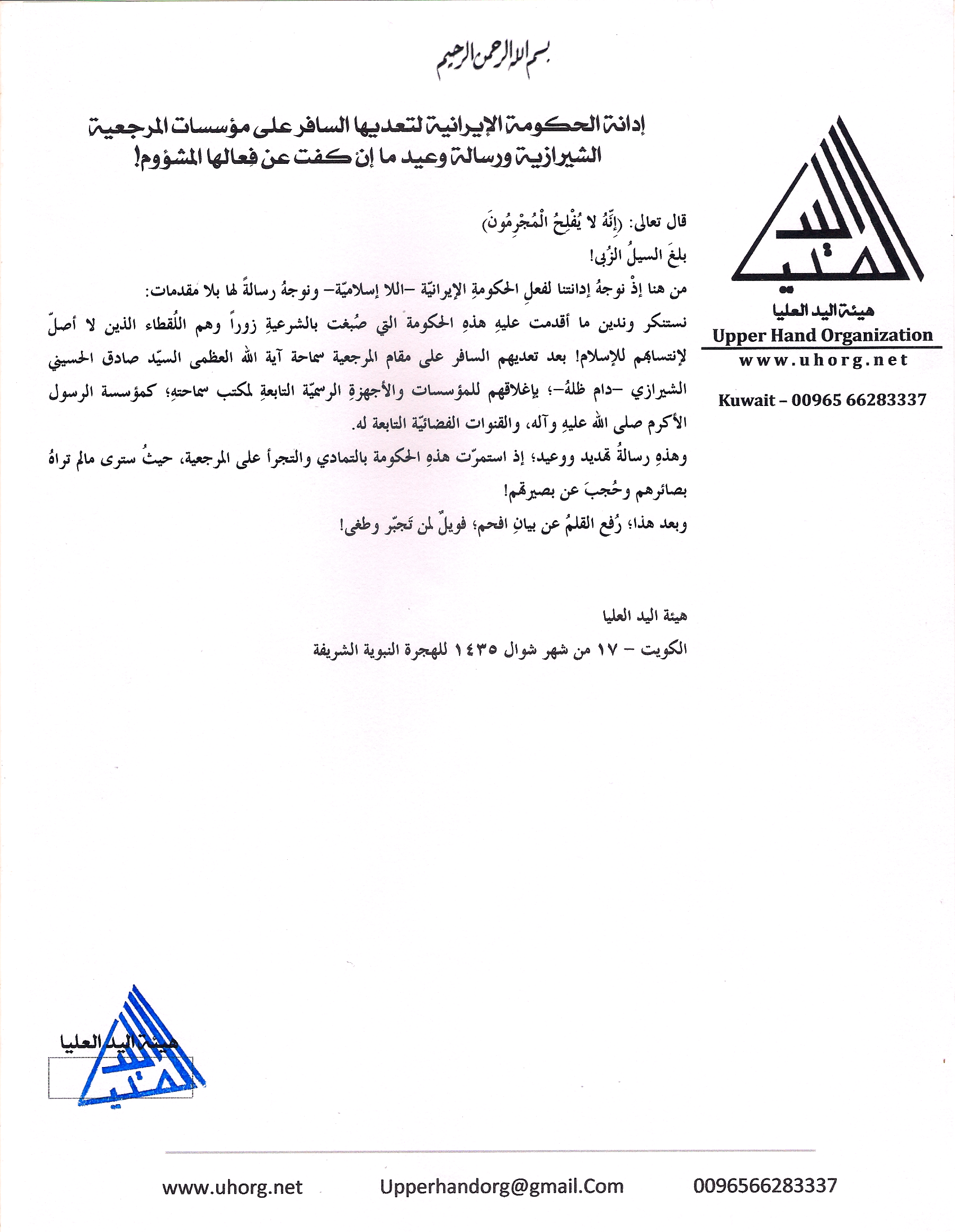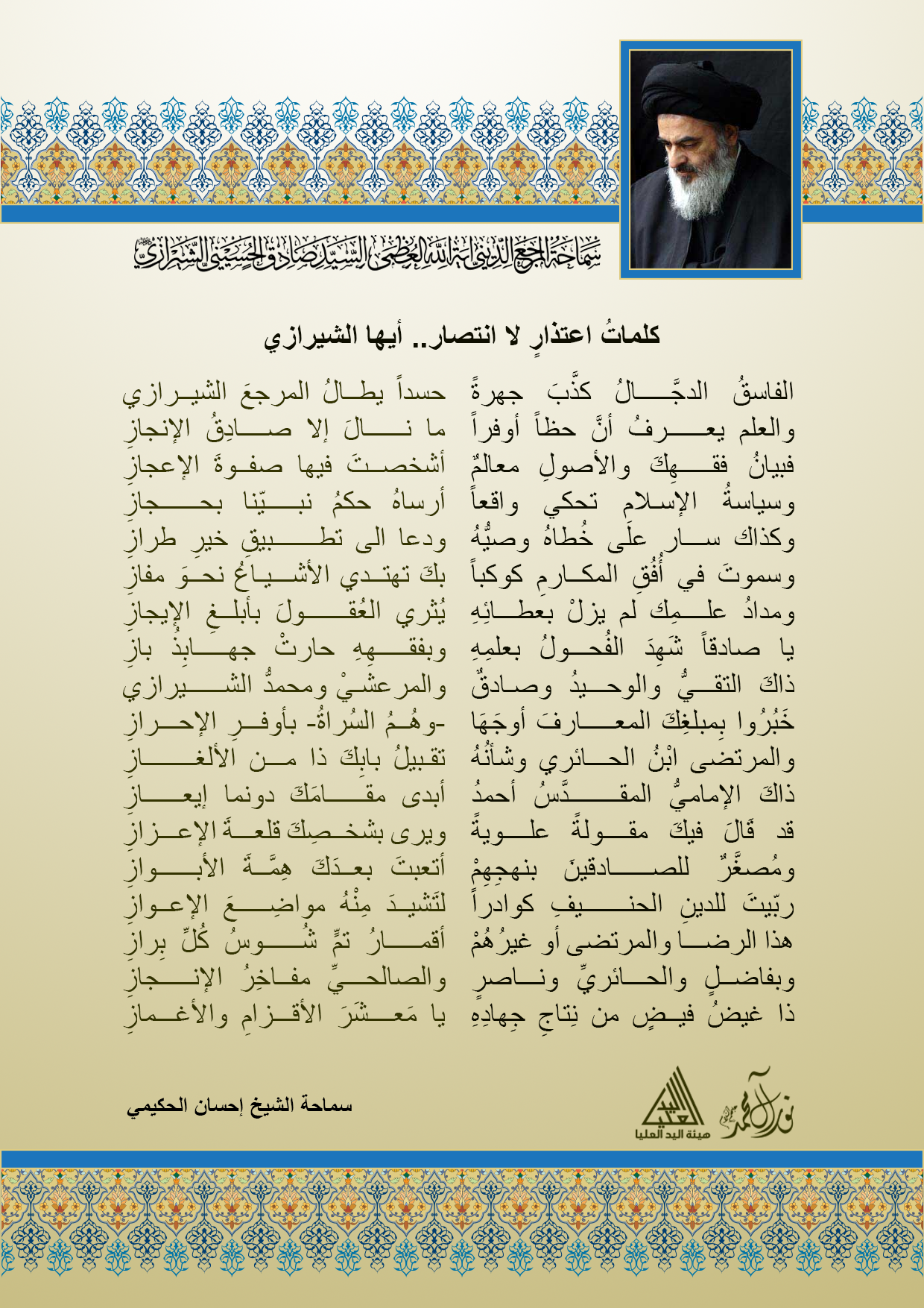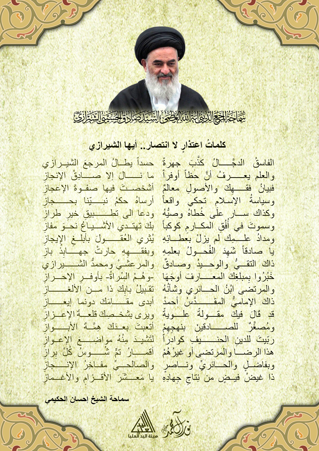 نستنكر وندين ما أقدمت عليه هذه الحكومة التي صُبِغت بالشرعية زورًا وهم اللقطاء الذين لا أصل لانتسابهم للإسلام، بتعدي سافر على مقام المرجعية، سماحة آية الله العظمى السيد صادق الحسيني الشيرازي، وإغلاقهم للمؤسسات والأجهزة الرسمية التابعة لمكتب سماحته، كمؤسسة الرسول الأكرم، والقنوات الفضائية التابعة له.