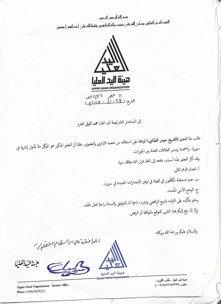 قبول استقالة وكيل الهيئة في سوريا 24/11/2015 أصدر المستشار العام لهيئة اليد العليا محمد الميل، قرارًا بقبول استقالة وكيل هيئة اليد العليا ومدير مكتبها في الجمهورية العربية السورية، الشيخ حيدر العدَّاي، من منصبه الإداري، والعمل بالقرار اعتبارًا من تاريخ صدوره. 🇸🇾 سوريـا