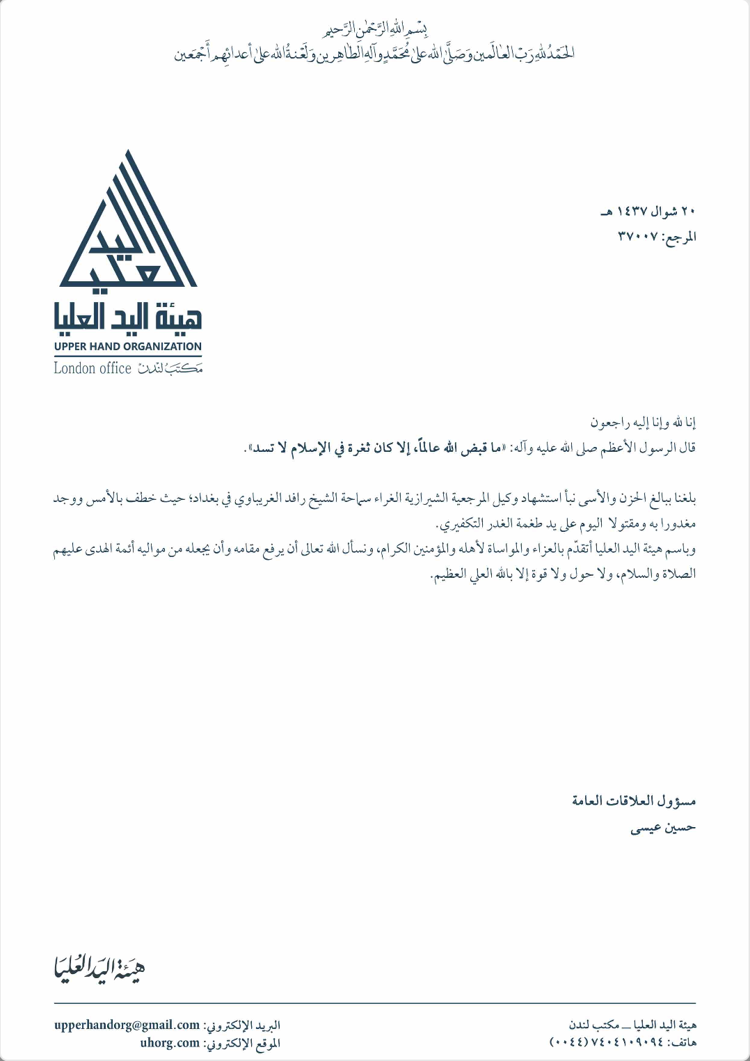 بلغنا ببالغ الحزن والأسى نبأ استشهاد وكيل المرجعية الشيرازية الغراء، سماحة الشيخ رافد الغريباوي، في بغداد، حيث خطف بالأمس ووجد مغدورًا به في ومقتولًا اليوم على يد طغمة الغدر التكفيري.