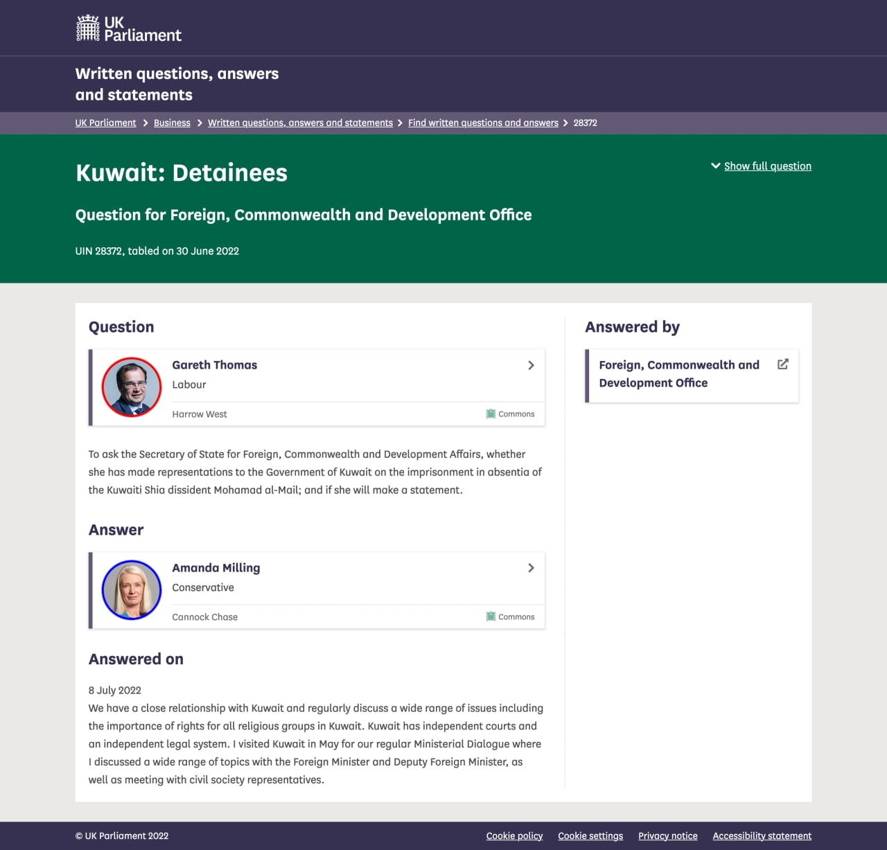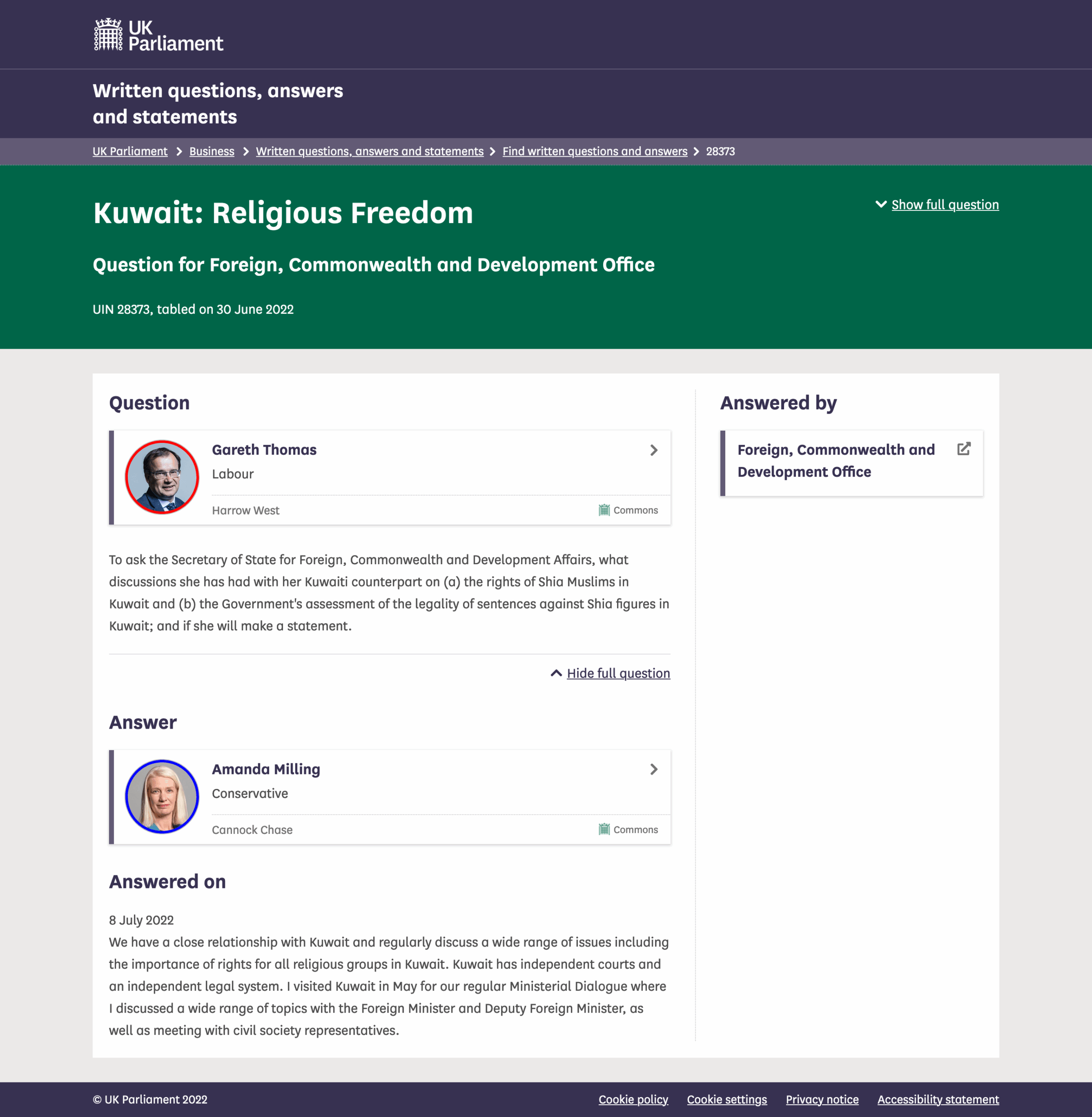 وفي رسالة الوزير الجوابية، المؤرخة بتاريخ 8 يوليو 2022م، اكتفى بجواب عام دون مزيد من التفصيل، قائلًا (مُترجَم): “لدينا علاقة وثيقة مع الكويت، ونناقش بانتظام مجموعة واسعة من القضايا بما في ذلك أهمية الحقوق لجميع الجماعات الدينية في الكويت. الكويت لديها محاكم مستقلة ونظام قانوني مستقل. لقد زرت الكويت في شهر مايو لإجراء حوارنا الوزاري المعتاد، حيث ناقشت مجموعة واسعة من الموضوعات مع وزير الخارجية ونائب وزير الخارجية، فضلًا عن الاجتماع مع ممثلي المجتمع المدني”.