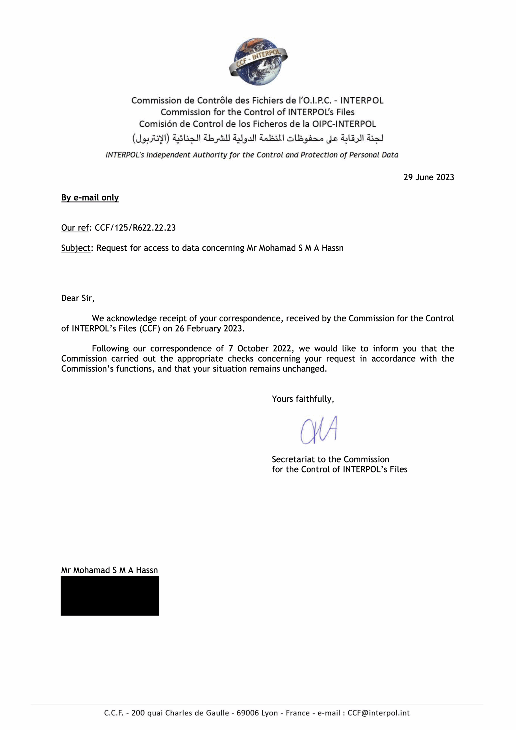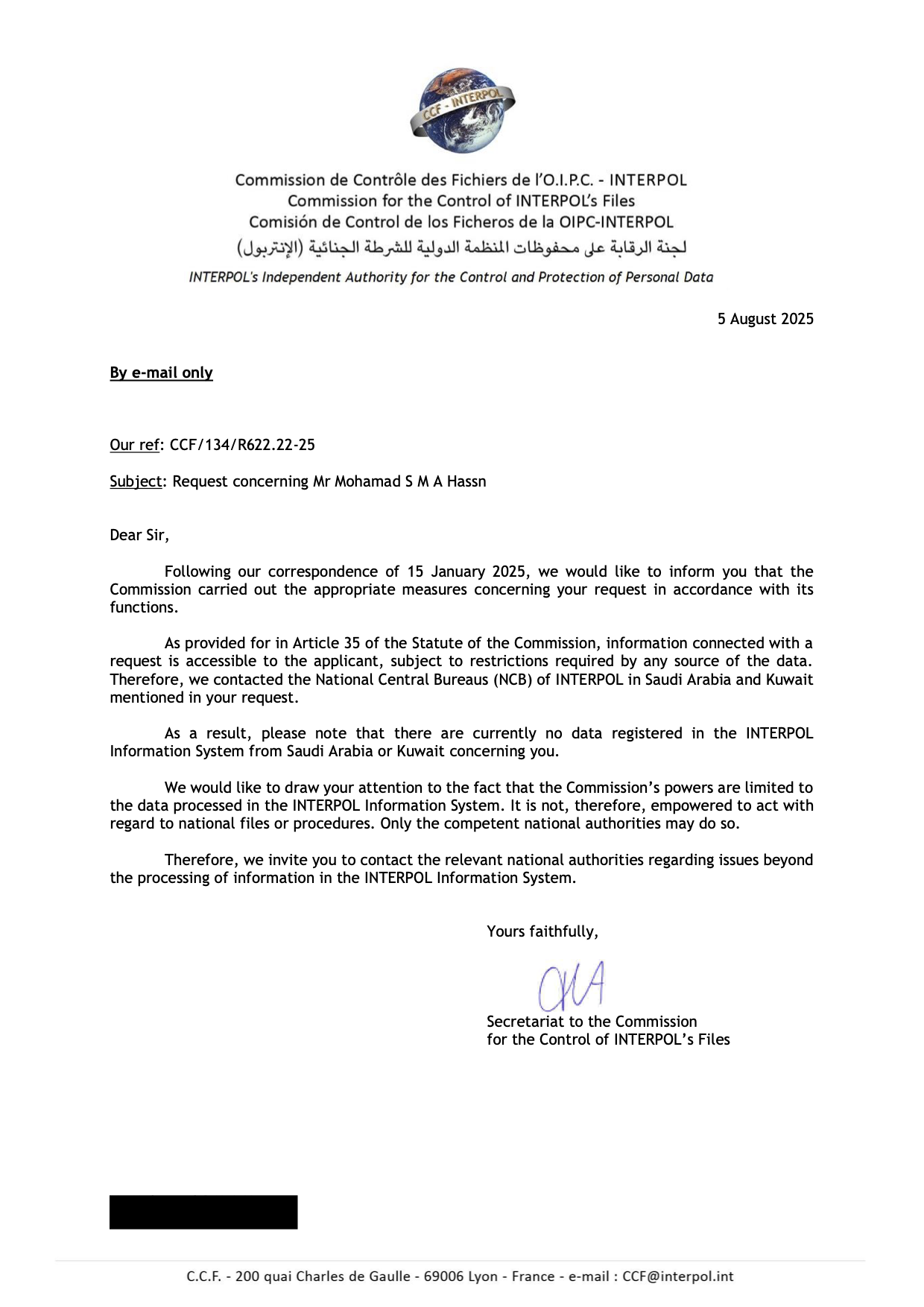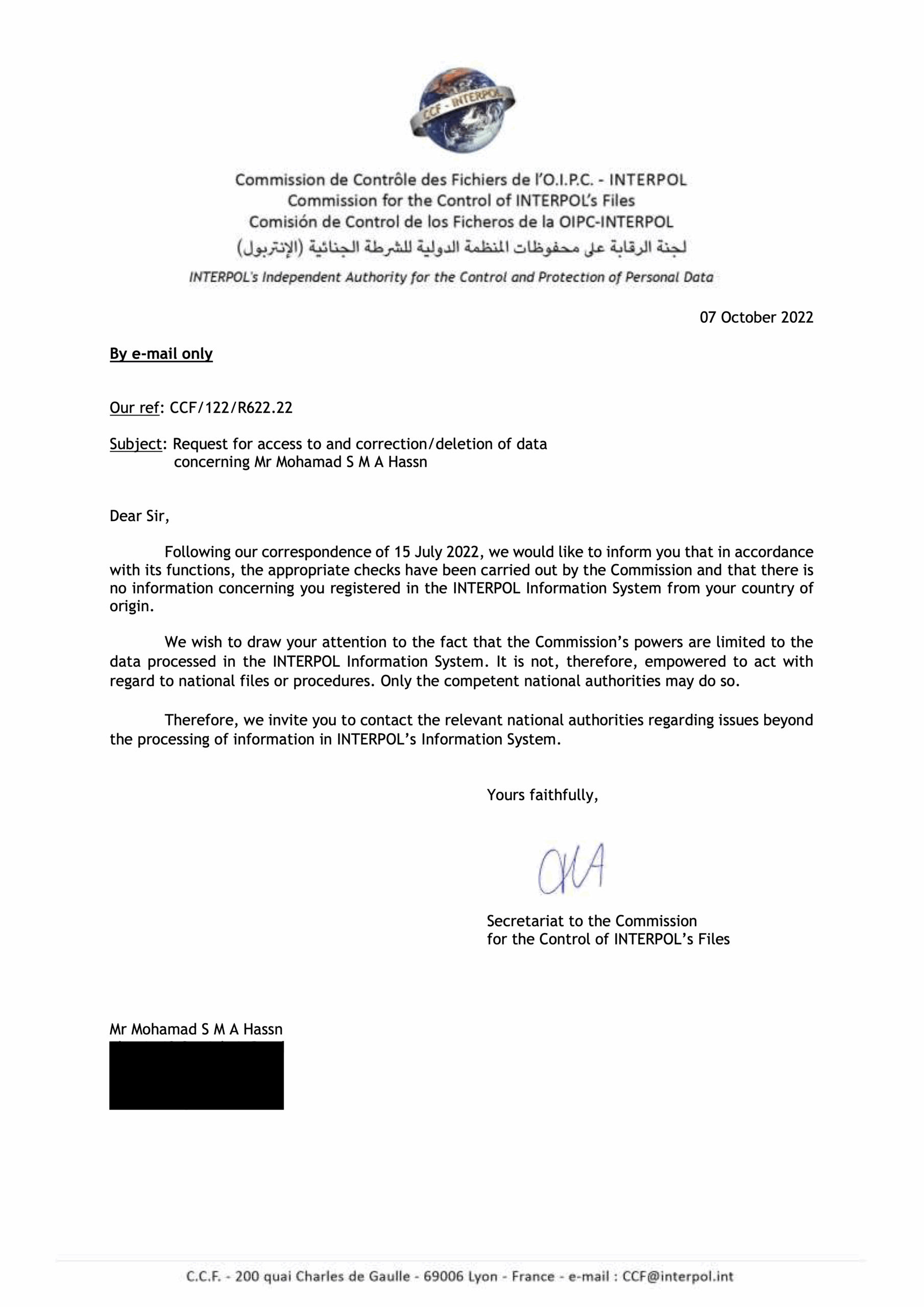 في 7 أكتوبر 2022، أكدت لجنة مراقبة ملفات الإنتربول (CCF) عدم وجود إشعار أحمر ضد محمد الميل في نظامها، بعد طلب من فريق قانوني مكلف من هيئة اليد العليا للوصول إلى البيانات وتصحيحها وحذفها.