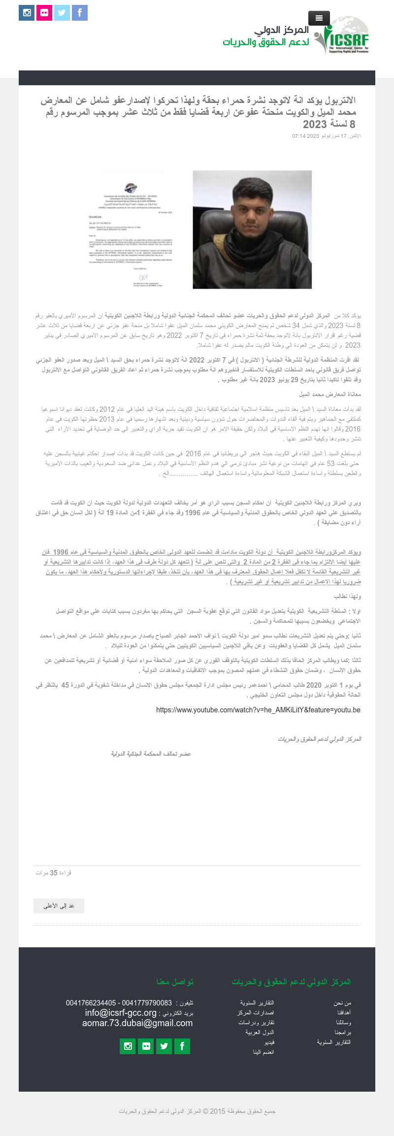 في 18 يناير 2023، حصل الميل على عفو بموجب مرسوم أميري عن أربع تهم تتعلق بأمن الدولة من إجمالي ثلاث عشرة تهمة، ومع ذلك، لم يتضمن المرسوم عفوًا عن تهم تتعلق بازدراء الدين والقضاء والجرائم الإلكترونية.