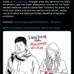 تحديث (9/12/2024): أدانت MENA Uncensored اعتقال محمد الميل بموجب قانون الإرهاب، ووصفت اعتقاله بأنه مثال مدمر على حملة النظام البريطاني القمعية على حرية التعبير، قائلة: “لقد وصل مستوى القمع إلى آفاق مثيرة للقلق”، وأضافت: “هذه لحظة مظلمة لحرية التعبير”.