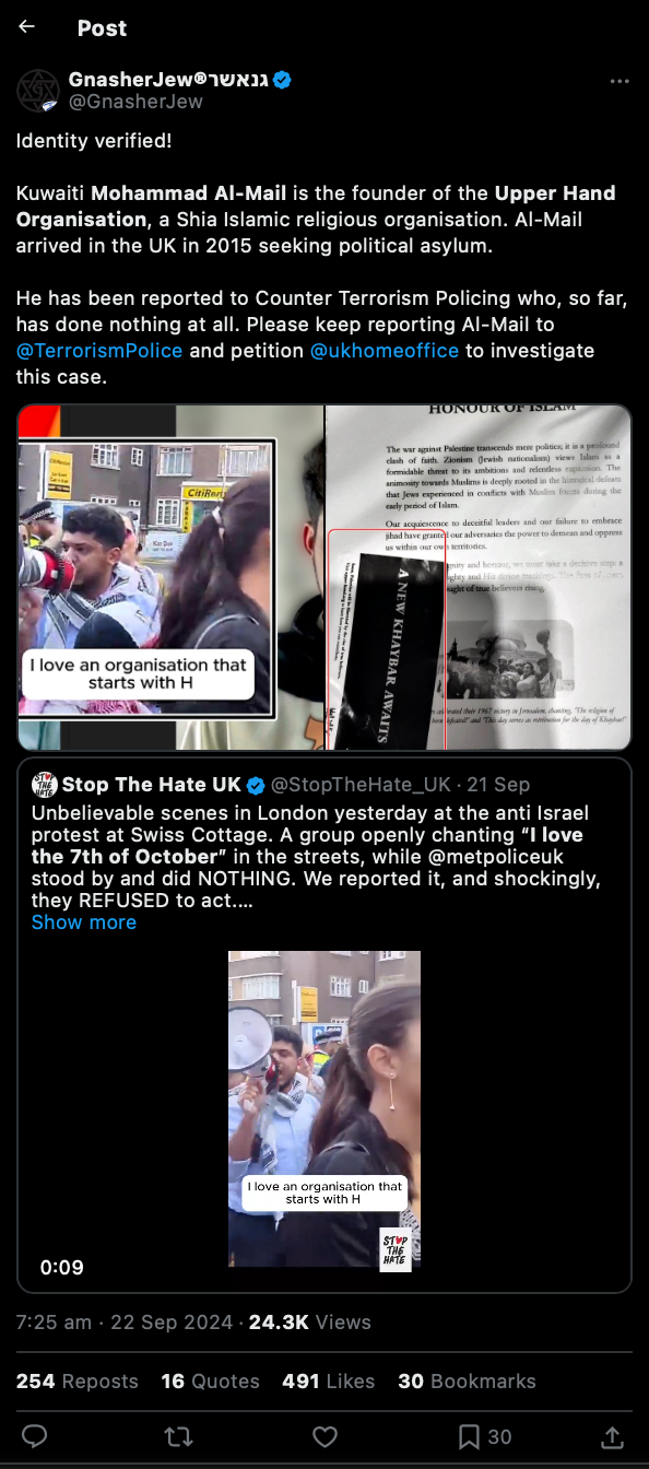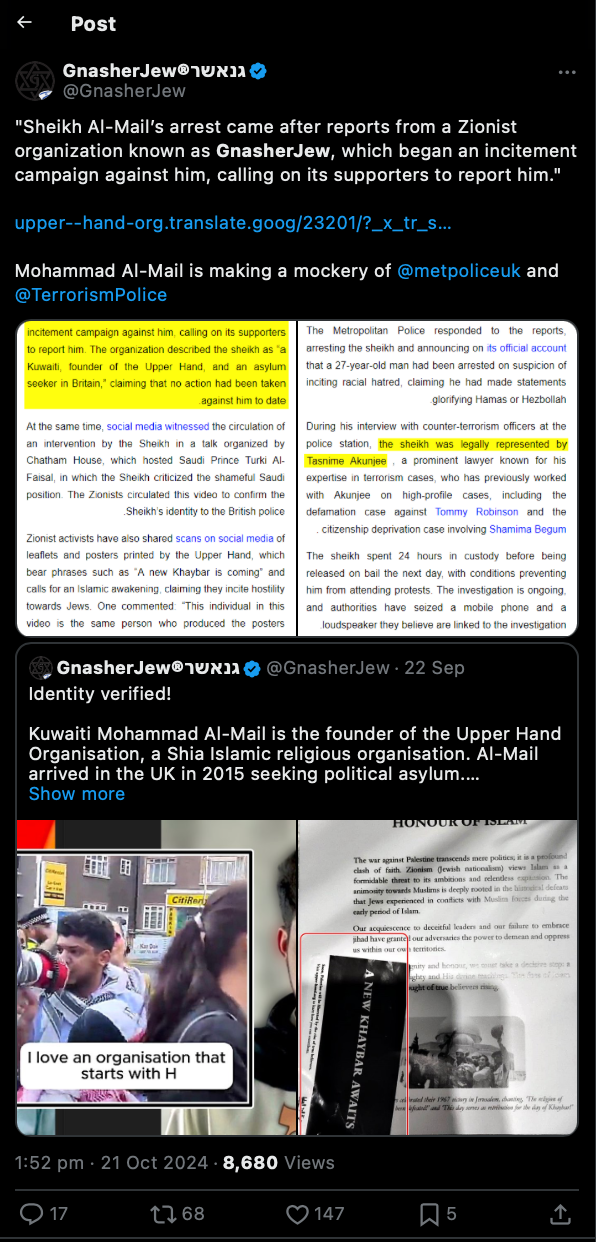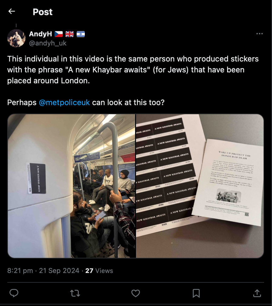 كما قام نشطاء صهاينة بتداول نسخ مصورة على وسائل التواصل الاجتماعي لمنشورات وملصقات كانت هيئة اليد العليا قد طبعتها، والتي تحمل عبارات مثل “خيبر جديدة قادمة” ودعوات لصحوة إسلامية، زاعمين أنها تحرض على عداء اليهود. علق أحدهم قائلًا: “هذا الفرد في هذا الفيديو هو نفس الشخص الذي أنتج ملصقات تحمل العبارة ‘خيبر جديدة قادمة’ والتي وضعت في جميع أنحاء لندن”.