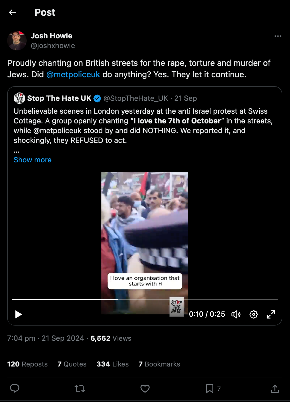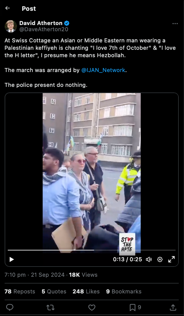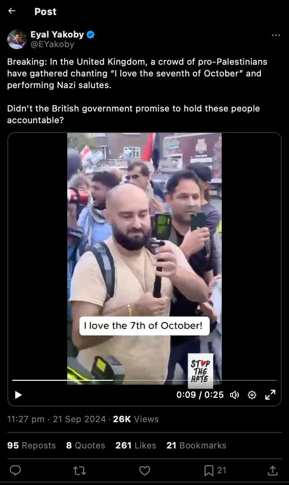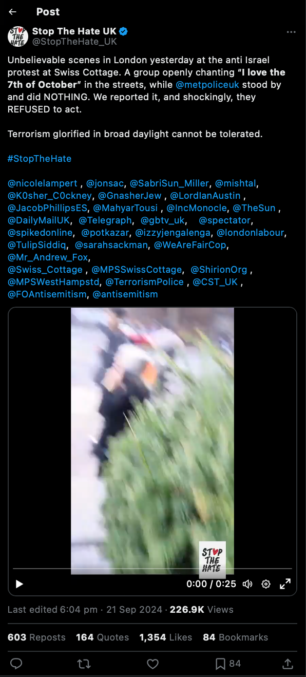 كما اجتهدت منظمة صهيونية أخرى تدعى أوقفوا الكراهية في المملكة المتحدة (Stop Hate UK) جهود الضغط على شرطة العاصمة لاعتقال الميل، منددةً بما وصفته بـ “تمجيد الإرهاب في وضح النهار”، واصفةً الموقف بأنه “مشهد لا يصدق”، وزعمت أنه ردد شعارات استفزازية، وقالت: “لا يمكن التسامح مع الإرهاب الممجد في وضح النهار”.
