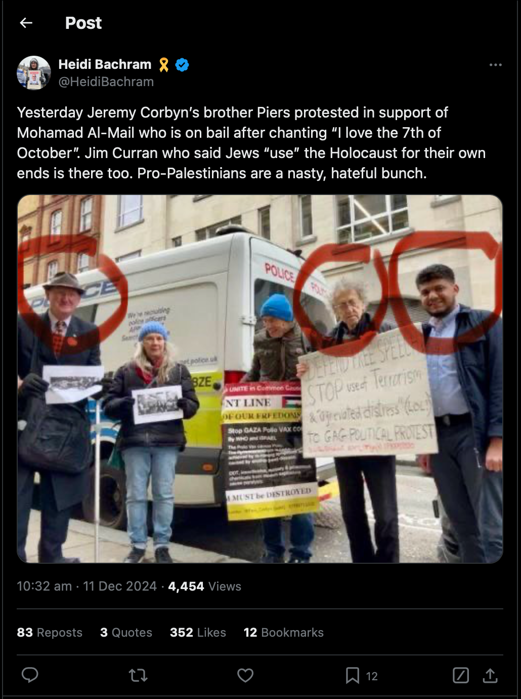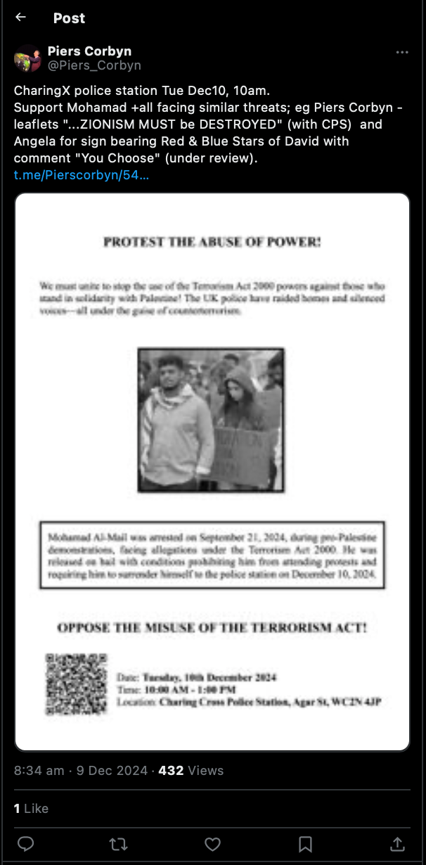 انتقد بيرس كوربين (Piers Corbyn)، شقيق زعيم حزب العمال السابق جيريمي كوربين (Jeremy Corbyn)، الوضع، قائلًا: “هل يمكن أن يكون النقد ضد السفير الإسرائيلي اعتداءً عنصريًا؟ إضافة الميل للإرهاب أمر جنوني”.