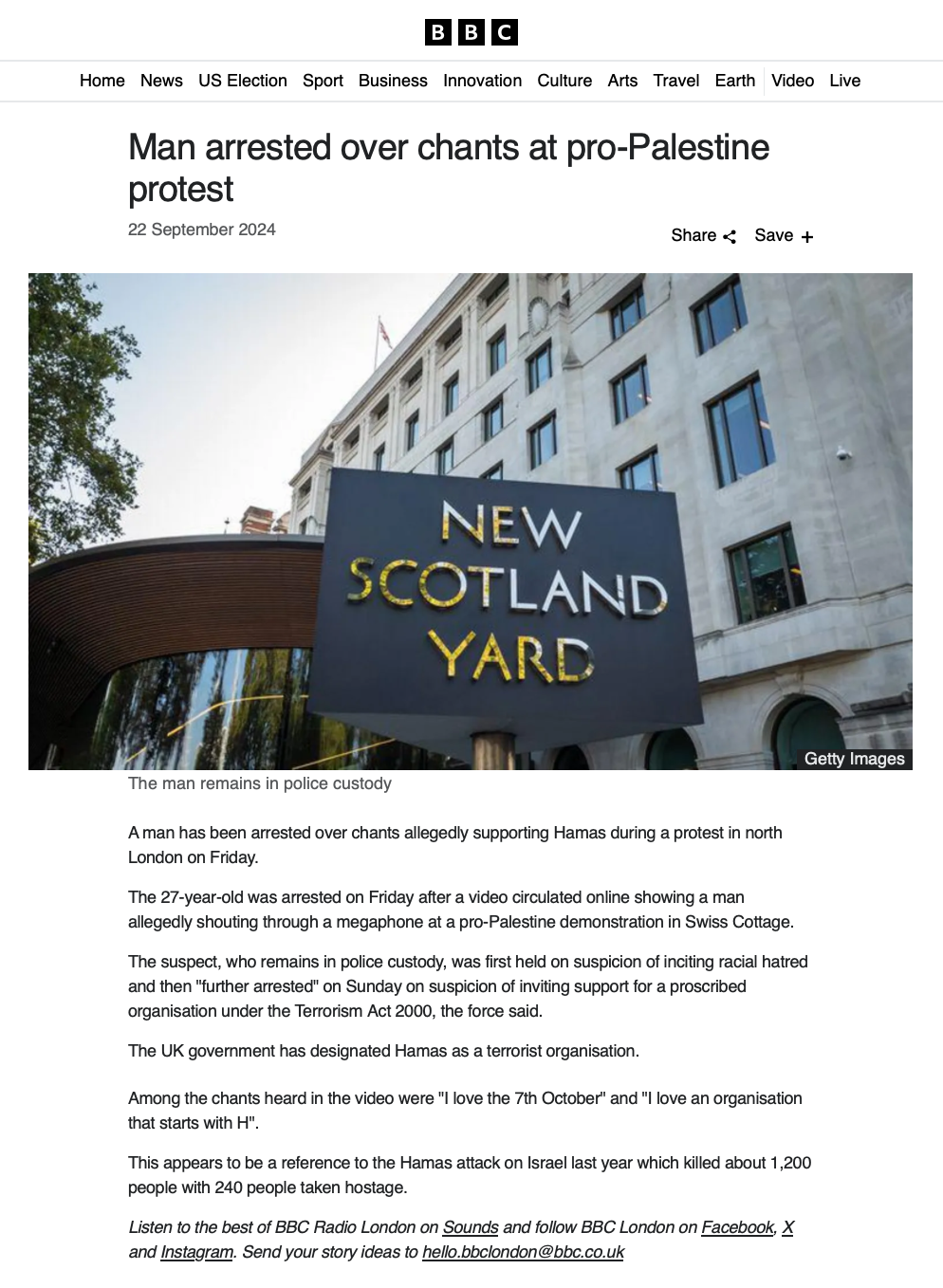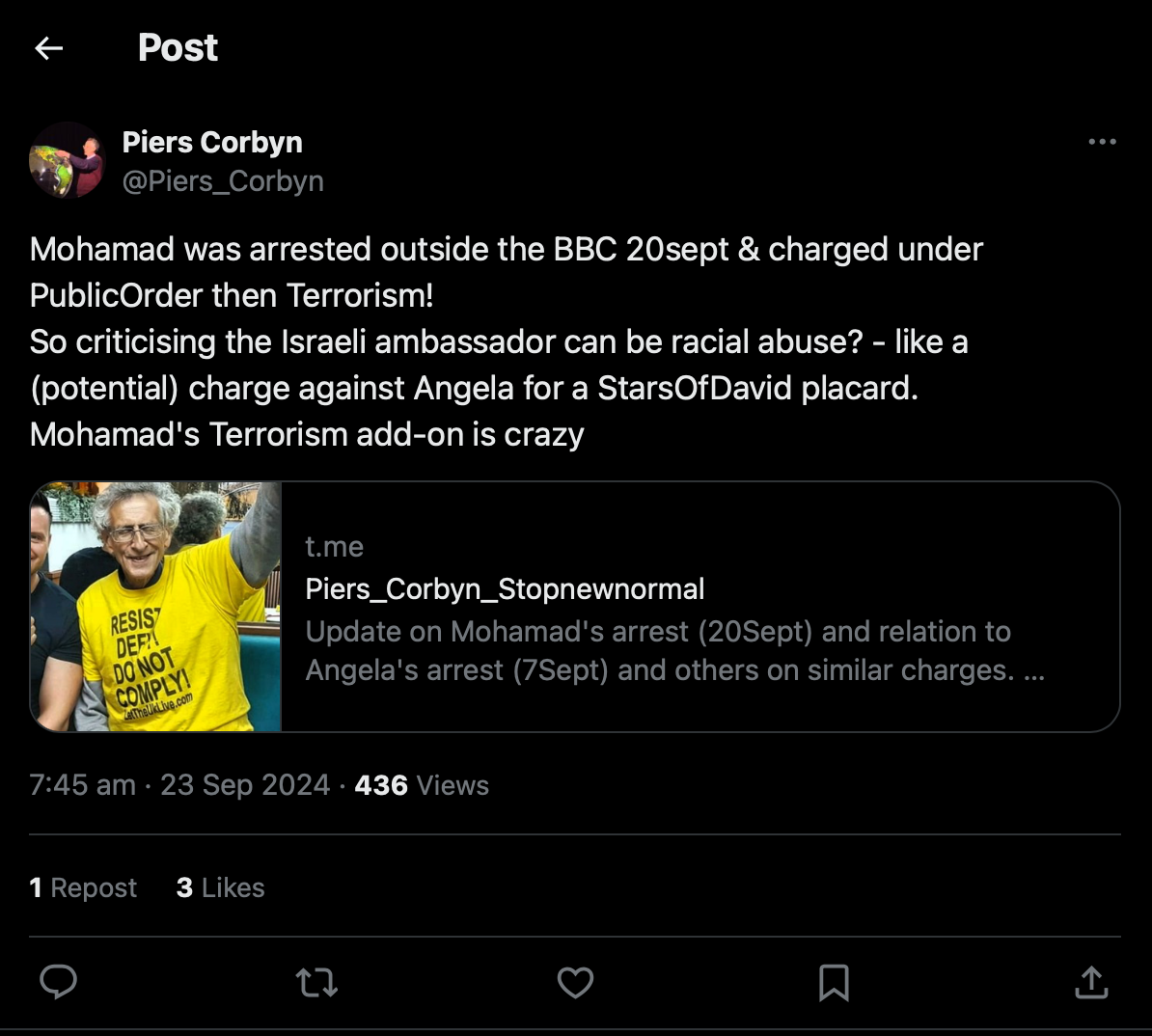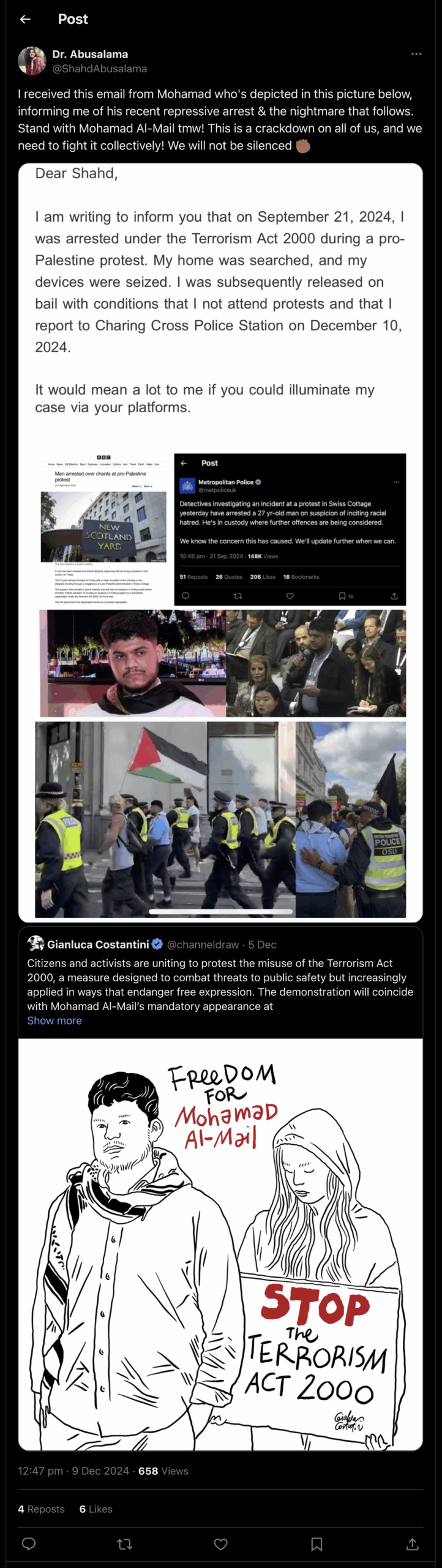 يأتي هذا الاعتقال بعد مشاركته البارزة في عدة احتجاجات في مختلف أنحاء البلاد، وخاصة الاحتجاج الذي نظم في سويس كوتج (Swiss Cottage) في 20 سبتمبر، والذي يجتمع فيه المئات كل أسبوع يوم الجمعة للمطالبة بطرد السفير الإسرائيلي من بريطانيا.