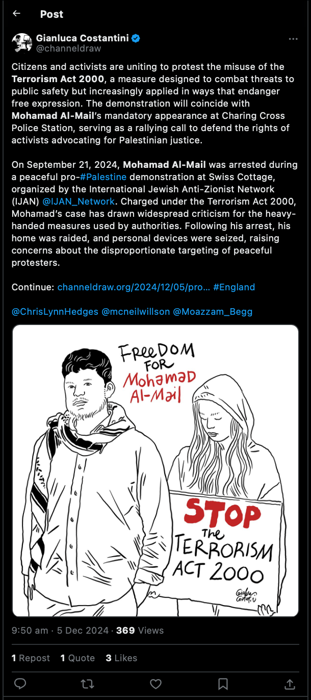 تحديث (9/12/2024): أدانت MENA Uncensored اعتقال محمد الميل بموجب قانون الإرهاب، ووصفت اعتقاله بأنه مثال مدمر على حملة النظام البريطاني القمعية على حرية التعبير، قائلة: “لقد وصل مستوى القمع إلى آفاق مثيرة للقلق”، وأضافت: “هذه لحظة مظلمة لحرية التعبير”.