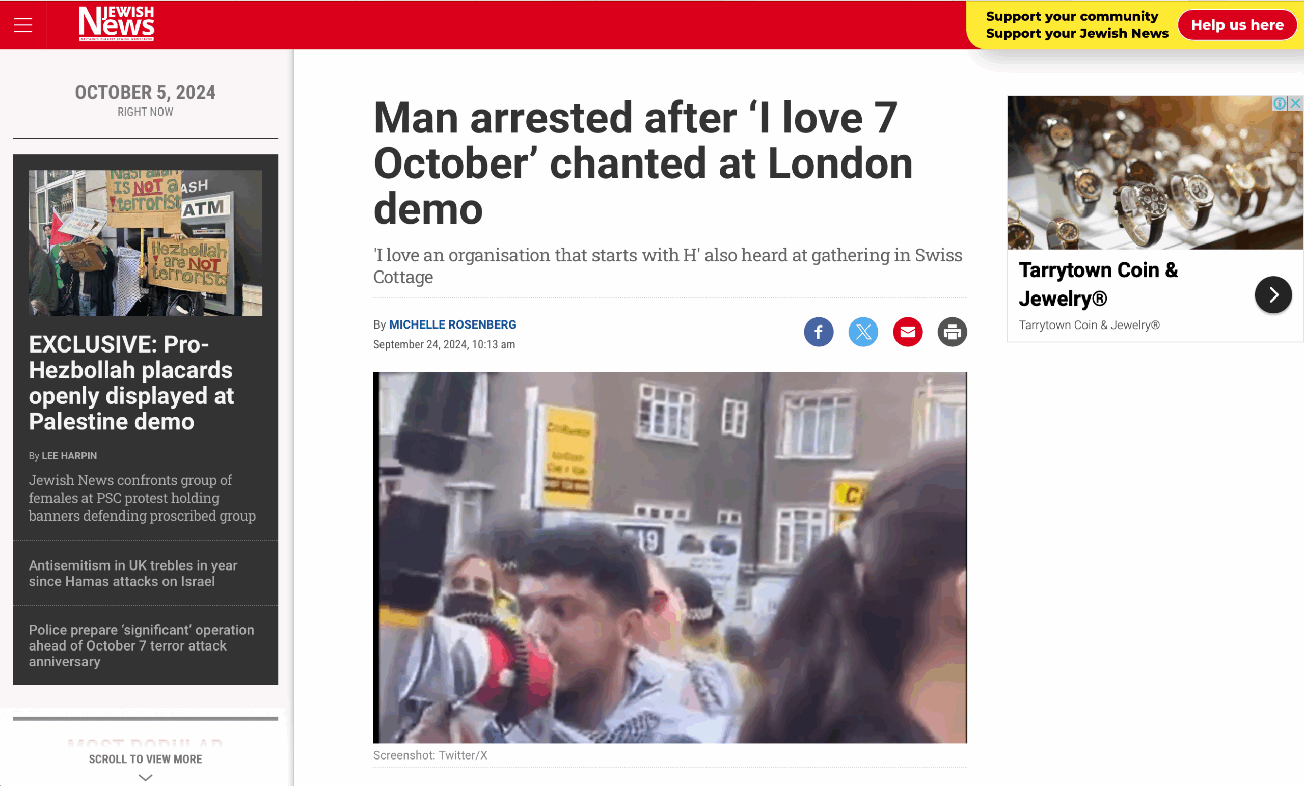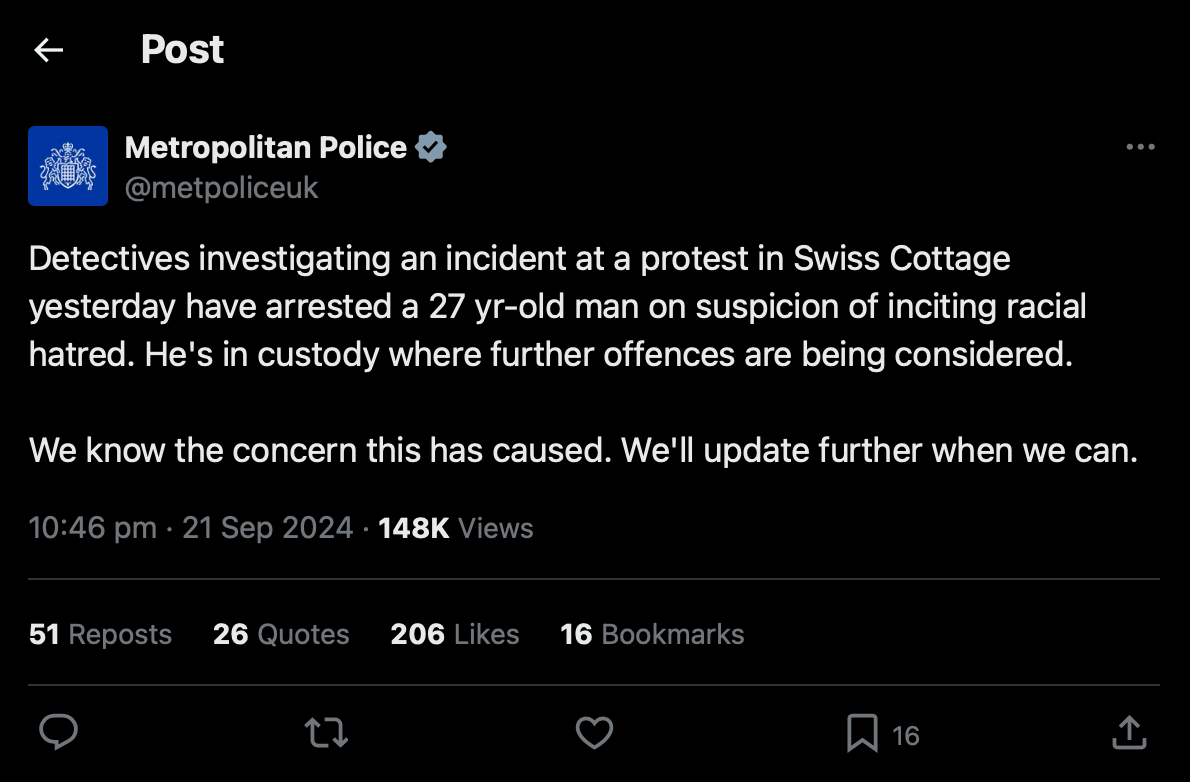 استجابت شرطة العاصمة للتقارير، فاعتقلت محمد الميل وأعلنت في حسابها الرسمي عن اعتقال رجل يبلغ من العمر 27 عامًا للاشتباه في تحريضه على الكراهية العنصرية، وزعمت أنه ردد عبارات تمجد حماس أو حزب الله.