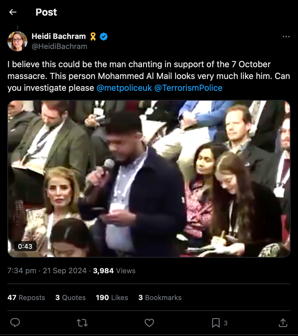 في الوقت نفسه، شهدت وسائل التواصل الاجتماعي تداول مداخلة للميل في حديث نظمته تشاثام هاوس (Chatham House)، استضافت فيه الأمير السعودي تركي الفيصل، حيث انتقد فيها الميل الموقف السعودي المخزي، وقد تداول الصهاينة هذا الفيديو لتأكيد هوية الميل للشرطة البريطانية.