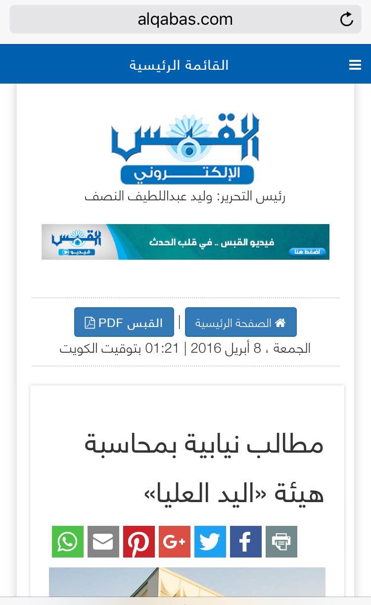 ■ جريدة القبس الكويتية: مطالبة نيابية بمحاسبة هيئة «اليد العليا»
