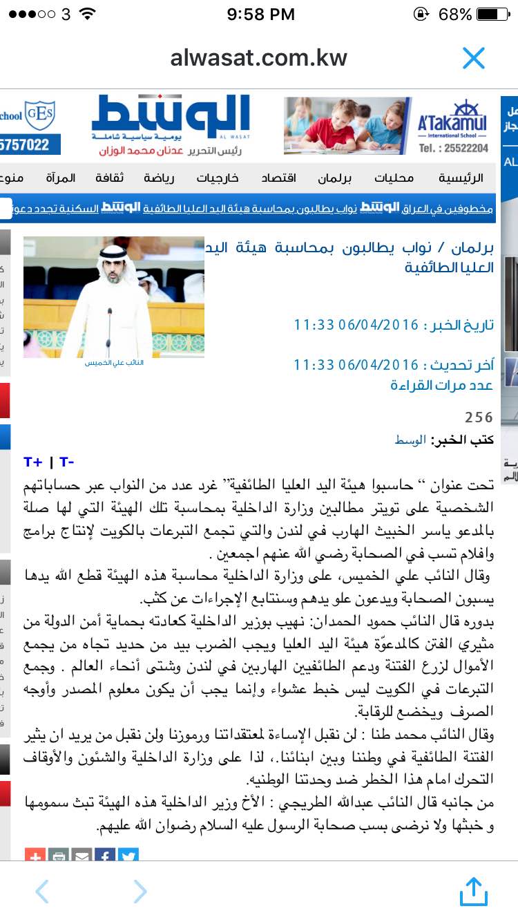 ■ جريدة الصباح الكويتية: نواب: «هيئة اليد العليا» تطعن في الصحابة وتثير الفتنة
